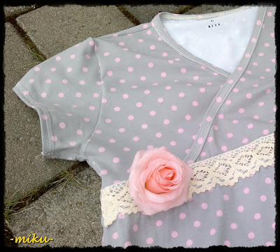 Alkukesästä ostesttu pilkkujersey taipui tänään mekoksi. Kaavassa yläosa oli liian korkea, joten vielä valmiista mekosta joutui leikkaamaan pätkän pois. Ei paha kuitenkaan. Tuo pelkkä pilkkukangas oli jotenkin yöpukumainen, joten lisäsin pitsin. Mutta vielä jäin miettimään, että olisiko pitänyt helmaan lisätä myös vai meneekö liian hörhelöksi. Ruusu ainakin pitää jostain tuohon saada. Tuo mikä on kuvissa mallina, on tytön ruusu ja sitä ei saa napakasti kiinni tuohon. Itseasiassa jos on